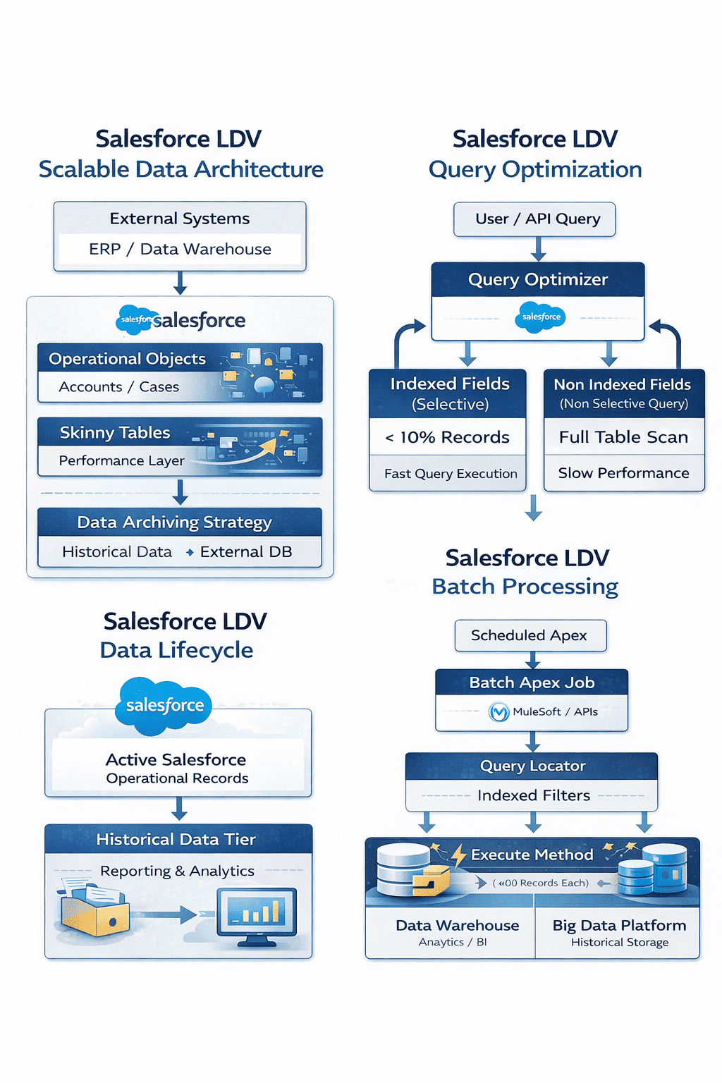 Modern Salesforce implementations often grow to millions or even billions of records. While Salesforce is highly scalable, handling Large Data Volumes (LDV) requires careful architectural planning. Without proper design, organizations may face slow queries, report performance issues, long batch processing times, and poor user experience.
